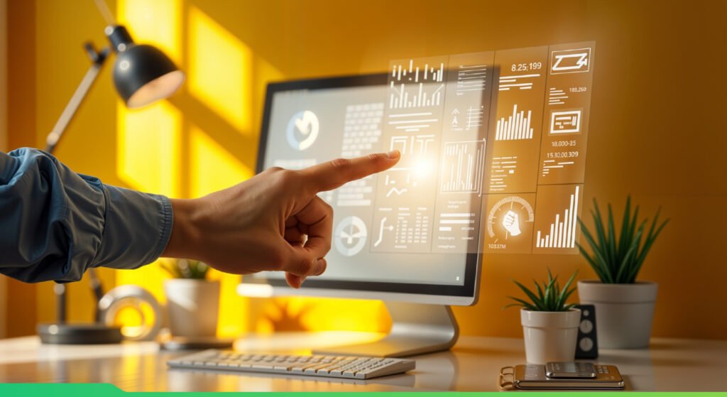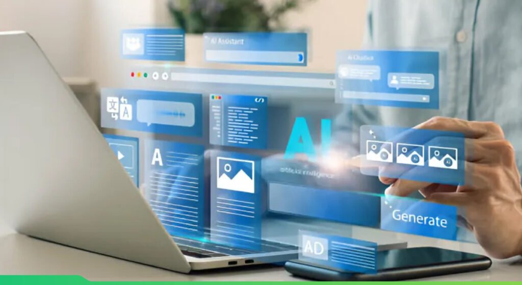 Professional working on computer with AI interface, showcasing the role of artificial intelligence in web development, chatbots, and smart personalization.